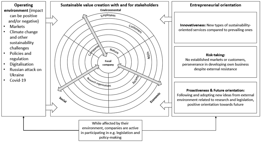 Sustainability challenges such as climate change and biodiversity loss have a great impact on the operating environment of companies. Business actors have increasingly sought answers to these challenges. A range of innovations, technologies and business models have been developed. Little is however known about those companies and entrepreneurs that strive for solving sustainability challenges. Sustainability-oriented entrepreneurship has interested researchers for a while. Nevertheless, studies have not thoroughly focused on forest-based services and related business models and value creation. This multiple case study investigates how the operating environment and entrepreneurial orientation are entailed in sustainability-pursuant value creation. We interviewed nine sustainability-oriented small and medium-sized enterprises providing forest-based services. The results indicate that the companies feature several entrepreneurial capabilities that enable them creating sustainable value. They are positively oriented towards future and consider their business as a solution to focal sustainability challenges. The companies’ operating environment can support the emergence and long-term development of sustainability-oriented businesses and innovations, and hence collaboration with stakeholders is essential for sustainable value creation. However, the established forest-based sector and existing support system have created tensions for the development of the sustainability-oriented businesses. The companies strive actively for making an impact on their operating environment to create sustainable value with and for their stakeholders. This study advances empirical research on sustainable value creation and entrepreneurship. Overall, this paper suggests that sustainability-oriented entrepreneurs need more collaboration and support for scaling up the solving of sustainability challenges.