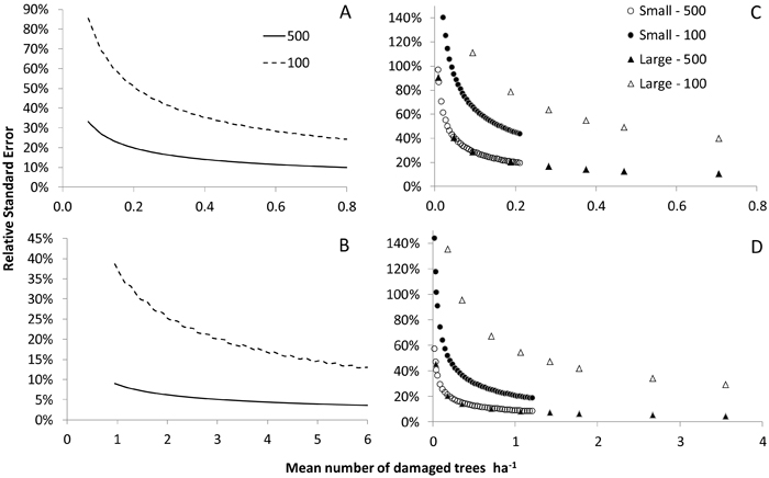 Fig. 3. Relative standard errors of estimators of the state at the initial time point (TP1; subfigs. A and B) and the increment, small and large, from TP1 to a subsequent time point (TP2; subfigs. C and D) in relation to the number of damaged trees ha–1 in Scenario 1 for the sparse (subfigs. A and C) and medium (subfigs. B and D) levels of tree damage at TP1. Results are shown for the full sample (N = 500) and a single year’s panel (n = 100).