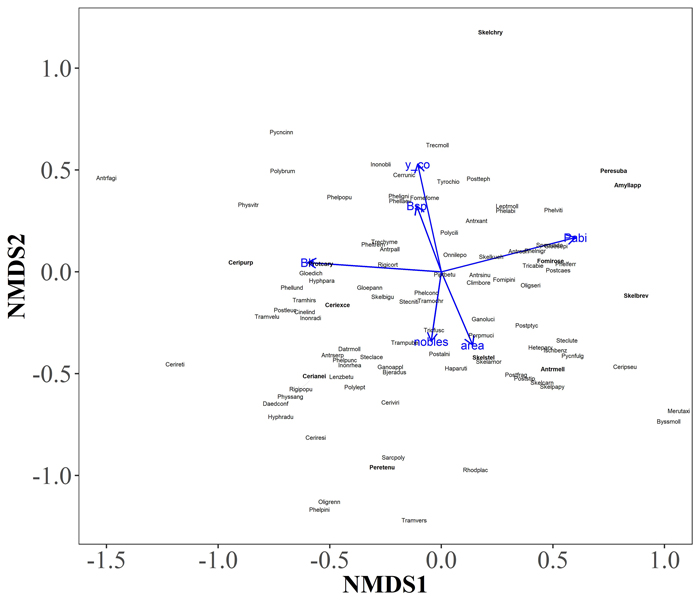 Fig. 6. A two-dimensional NMDS solution locating polypore species, and fitted environmental factors. Only environmental factors with p-value < 0.05 are displayed: Pabi, Picea abies (r = 0.39); Blt, other deciduous trees (r = 0.35); y_co, northern coordinate (r = 0.34); area, size of the surveyed area (r = 0.16); Bsp, Betula spp. (r = 0.13); nobles, so-called noble tree species (Tilia cordata, Acer platanoides and Corylus avellana) (r = 0.13). The tree species vectors are given as the number of coarse woody debris (CWD) of each tree species per hectare. Red-listed species are shown in bold. The polypore species scores of the NMDS solution are given in Supplementary file S4. View larger in new window/tab