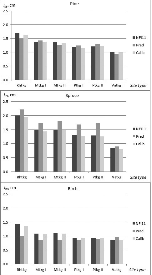 Fig. 3. Observed and predicted diameter growth of pine, spruce and birch in the calibration data (NFI11) in the different site types (NFI11; observed values, Pred; prediction obtained by the constructed model, Calib; prediction calibrated with NFI11).