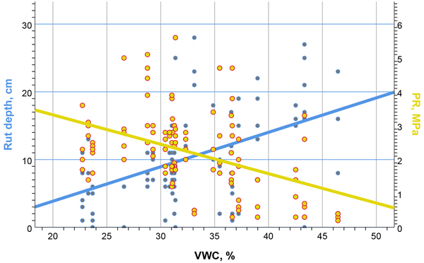 Increase both in BD and VWC decrease PR, which increases with total overdriven mass. According to the model 2 in Table 4, if BD is 1.4 g cm–3, calculated PR values with 25, 30 and 35% VWC values after total overdriven mass of 90 000 kg are 2.3, 1.8 and 1.5 MPa and after 180 000 kg 2.5, 2.1 and 1.7 Mpa. With BD of 1.2 g cm–3 the values after 90 000 kg are 2.9, 2.4 and 1.9 and after 180 000 kg 3.3, 2.7 and 2.2 MPa, respectively.