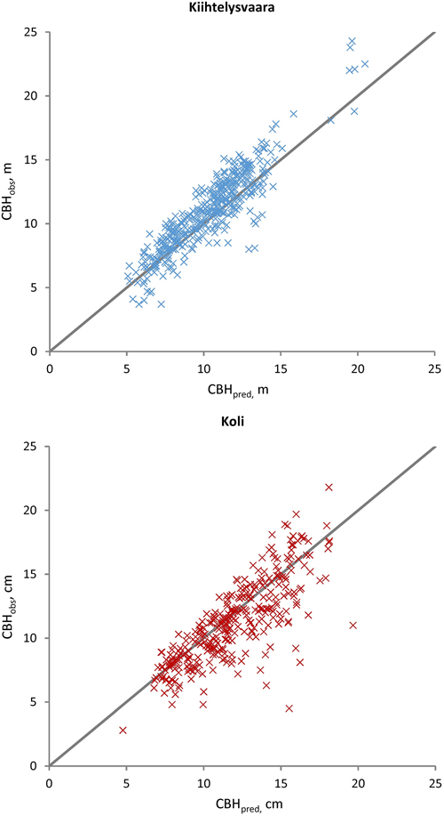 Fig. 4. Observed (CBHobs) versus predicted (CBHpred) Scots pine crown base heights at the Kiihtelysvaara and Koli test sites. The predicted values were obtained with the fixed part of the mixed model trained at the Liperi site.