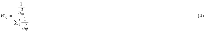 where Wuj is the weight between the plots u (target) and j (reference), k is the number of nearest neighbours and