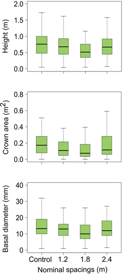 Fig. 3. Estimated values (lower hinge = within 1.5 times interquartile range below first quartile, lower end of box = first quartile, middle of box = median, upper end of box = third quartile, upper hinge = within 1.5 times interquartile range above third quartile) for conifer seedling characteristics in next rotation balsam fir stands as influenced by different intensities of precommercial thinning in previous stands.