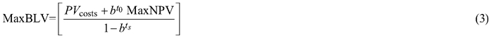 , where BLV = the bare land value for plot, € ha–1, PVcosts = the present value of silvicultural costs, € ha–1 (see Eq. 1) and MaxNPV = the maximum net present value obtained through stand-level optimization, € ha–1 (see Eq. 2), t0 = the time point when the simulation of the ongoing rotation was initiated, here either in year 31 or 32, ts = the time for final cut, years and b = the discrete time discount factor, i.e. b = 1/(1+r) and r is the annual interest rate.
