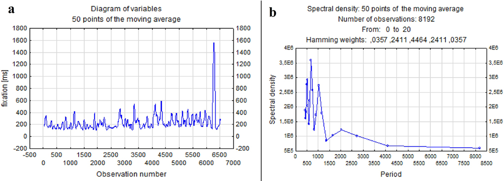 Subsequent fixation times were arranged in cycles, which were treated as regular fluctuations of a time series. These cycles were considered to be repetitive periods of variable eye activity. Figs. 8–10 present a graphical analysis of the time series: some segments of the periodograms clearly indicate shorter work cycles. Since the periodograms showed strong fluctuations even after smoothing, the descriptive data available in the “results” window for the Fourier (spectral) analysis of a single variable were also analysed (StatSoft Inc. 2009).