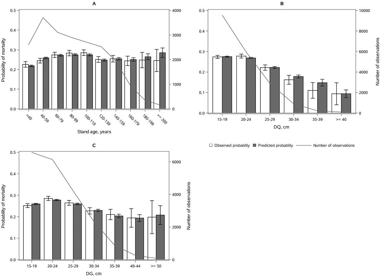 Fig. 2. Observed vs predicted 5-yr probability of mortality (with 95% confidence limits) by classes of A) stand age, B) quadratic mean dbh, DQ and C) basal area weighted mean dbh, DG. The line depicts the number of observations in each class. View larger in new window/tab.