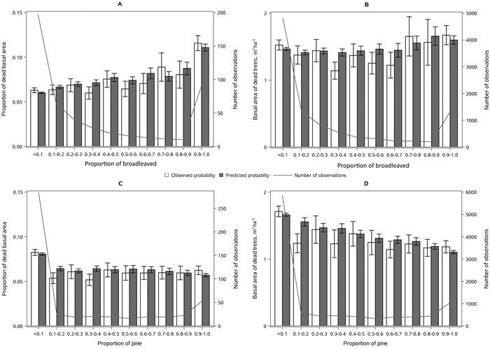 Fig. 7. Mean observed vs mean predicted 5-yr amount of mortality (with 95% confidence limits) as proportion of basal area (A, C) and absolute basal area (B, D) by the proportion of broadleaves (A, B) and proportion of Scots pine (C, D) of stand basal area. The line depicts the number of observations in each class. View larger in new window/tab.
