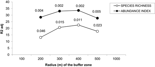 Fig. 3. Percentage of variance of bird species richness and abundance index explained by the multiple linear model in which the coordinates of sampled poplar stands along the significance axes from PCAs are included as explanatory variables. The p-values for each radius buffer are shown above each line for each buffer size. No values were represented for buffers of radius 100 and 1000 m because the respective models were not significant. Species richness: number of different species represented in each stand. Abundance index: sum of the heard and seen birds, using a semi-quantitative abundance index where a territorial male or pair was noted as 1 and a non-singing bird was noted as 0.5.