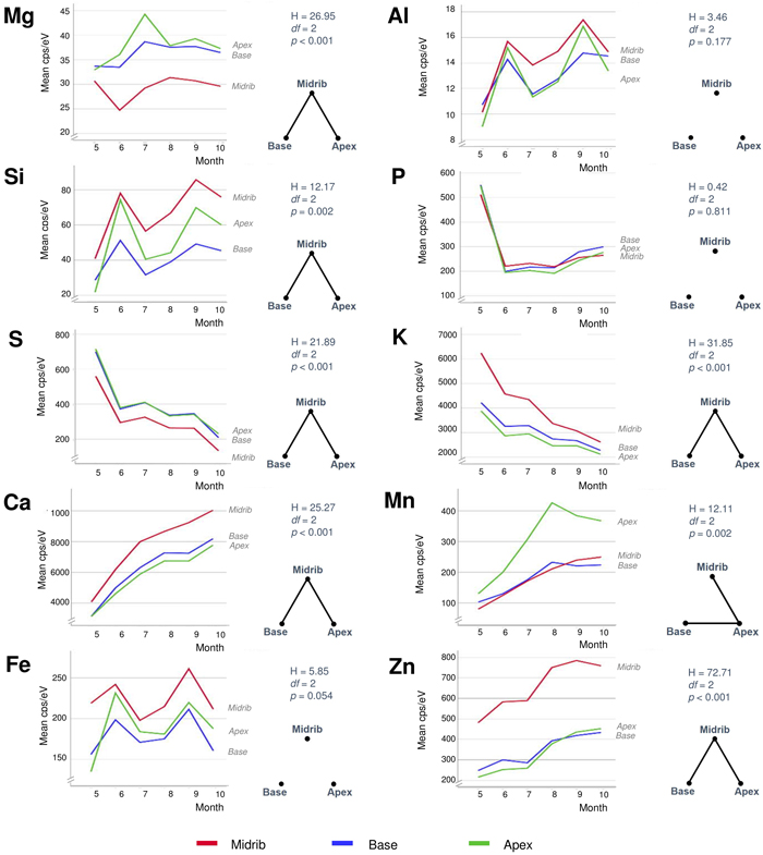 Seasonal developments in the different habitats are visualised as line charts based on the mean values (n = 9, i.e., three sampled leaves with three measurements from each habitat). Statistical differences in the element contents between the different habitats were tested by using the Kruskal-Wallis test with post hoc Dunn-Bonferroni adjustment for their pairwise comparisons. Element contents in the different leaf areas (midrib, base and apex) were compared using line charts showing their monthly mean values (n = 6, i.e., six leaves each month). We tested statistical differences between the different leaf areas using the Kruskal-Wallis test with post hoc Dunn-Bonferroni adjustment for their pairwise comparisons.