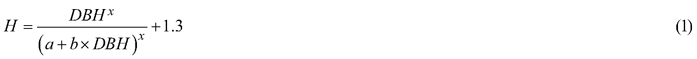 DBH was used to calculate basal area (m2) and the relationship of diameter and height for sample trees was used to estimate the height of all trees whose height was not measured, using species-specific height functions (Eq. 1), where x = 2 for Norway spruce and x = 3 for birch (Näslund 1947). The a and b parameters were calculated separately for each plot, revision and tree species.