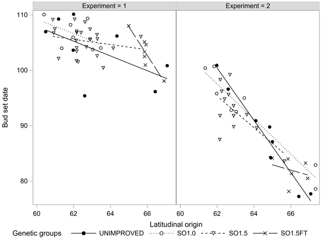 The growth termination events GRCESS and BUDSETDATE were linearly related to the latitudinal origin: The northern origins ceased their growth before the southern ones regardless of the genetic level. Both events occurred considerably later in EXP1 compared to EXP2. Furthermore, the clinal trend was markedly less pronounced in EXP1 (Figs. 3 and 4). The southern SO1.5 materials in EXP2 appeared to have a slightly earlier BUDSETDATE than the unimproved materials (p < 0.104). However, none of the pairwise tests conducted in both experiments yielded a statistically significant result (Table 2).