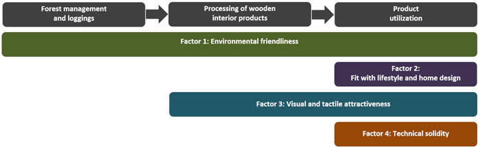 In the context of wood product purchasing choices, preferences for environmental, social, or economic sustainability are not usually separate from each other, but are instead intertwined with each other among consumers to differing extents (Toppinen et al. 2013). In addition, depending on the intended use of the product (i.e., visible surfaces or non-visible purposes), the purchasing preferences of the consumers may vary, for example, due to differing expectations for longevity or aesthetics. The focus of this study is on wooden interior products (e.g., furniture, small home ornaments), which do not have similar technical requirements to wood products used in load-bearing structures (e.g., strength grading). In addition, since visual and tactile properties are also important aspects of wooden interior products (Strobel et al. 2017), these products provide an interesting starting point to evaluate how consumers perceive sustainability in relation to different attributes.
