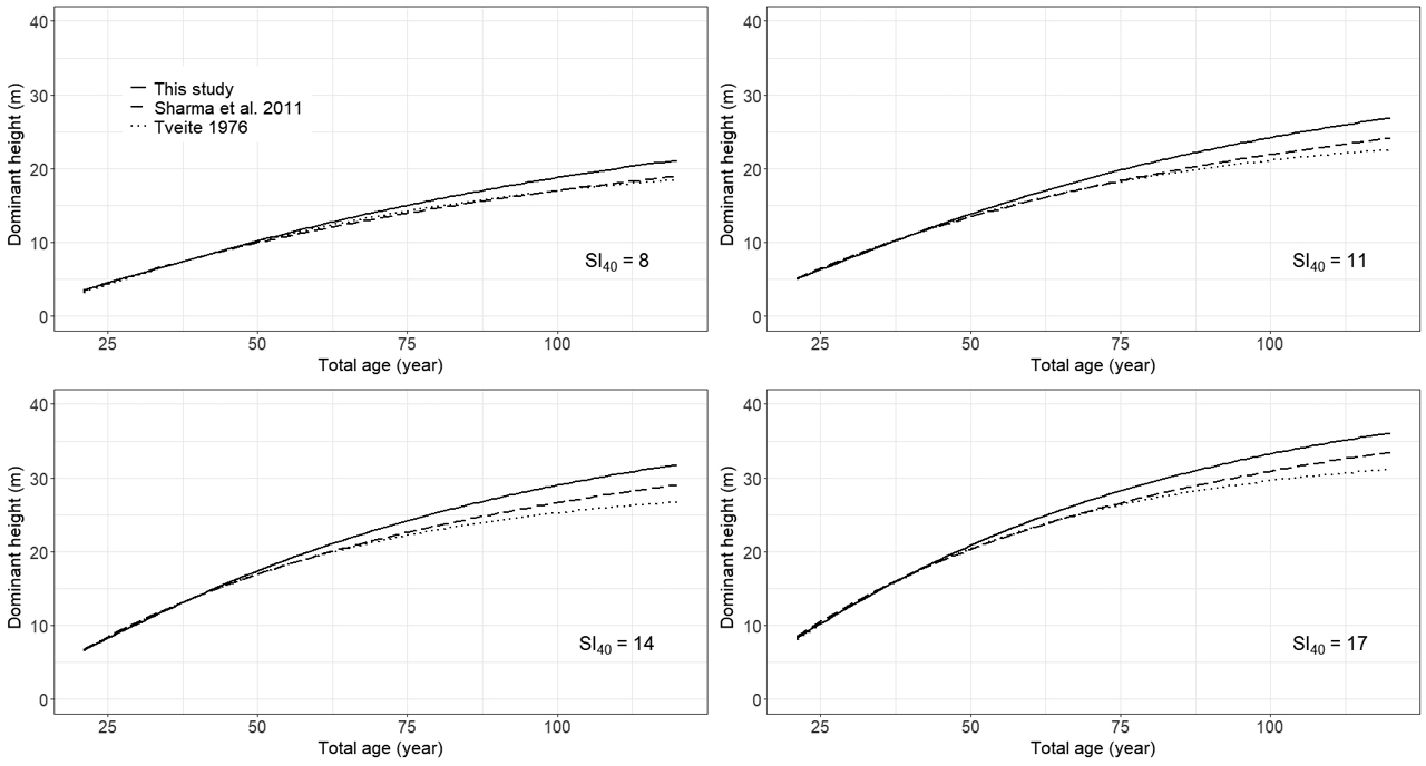 A comparison of dominant height-age curves produced from Eq. 5 and existing models revealed differences in HTDOM development at higher ages, with the curves of Tveite (1976) and Sharma et al. (2011) tending towards lower HTDOM when compared to the curves from this study (Fig. 5).