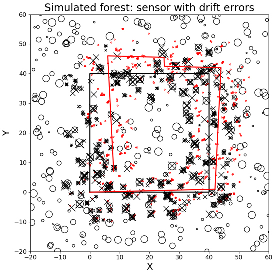 Fig. 3. A simulation of a moving sensor with drift errors co-registering a forest stand. The black circles are trees from the forest stand with diameters proportional to the size of the trees. The black rectangle is the true sensor path, and the red track is the sensor path with errors. The small red dots are the tree positions with errors and the black x’s are the tree positions after co-registration.