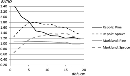 Marklund’s 1988) and Repola’s (2008, 2009) models exhibited differences in predicted biomass of the tree components compared with the NEW models. Marklund’s and Repola’s models estimated, on average, higher stem biomass values for pine and spruce, but lower biomass values for birch (Table 6). In terms of RATIOM (0.85) and RATIOR (0.84) the higher estimates for spruce amounted to an average of 15%. For pine, the estimates were still high, but not as high: RATIOM and RATIOR values were, on average, 0.99 and 0.90. The NEW models resulted in higher biomass predictions for birch stems, with an average RATIOM and RATIOR of 1.13 (Table 6).