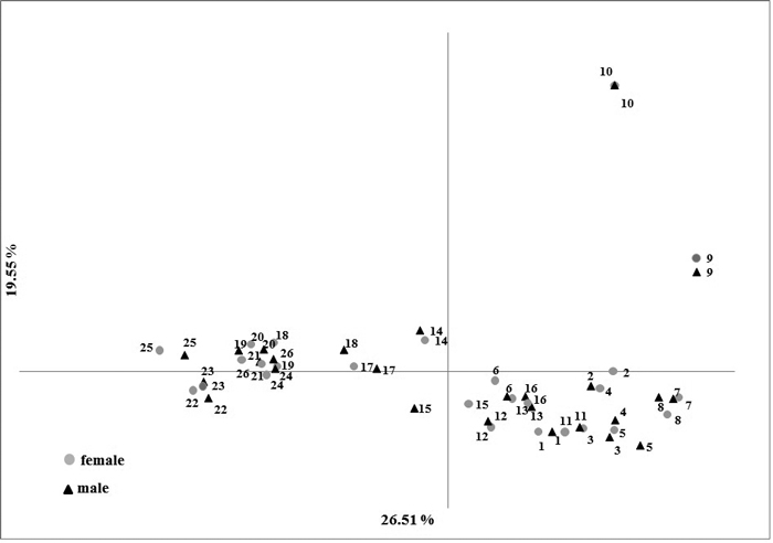 No significant difference (p-values > 0.1) were observed in the averages of the genetic variation estimators between male and female individuals (Table 3). The difference in the Fst in male and female samples (0.152 and 0.149, respectively) was not statistically significant (p-value = 0.901) (Table 3). These relationships are well illustrated in the PCoA plot where male and female individuals share a common subgroup for each population. The first and second principal coordinates accounted for 26.51% and 19.51% of the total variation, respectively (Fig. 2).