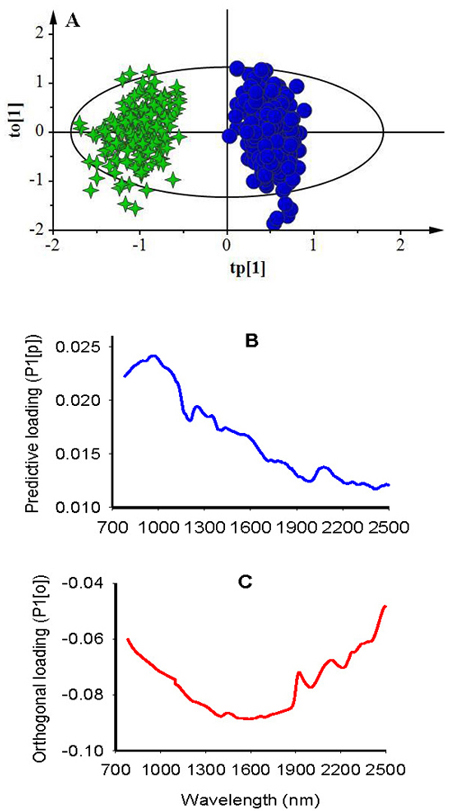 Fig. 3. Score plot for the first predictive (tp[1]) versus orthogonal (to[1]) components showing symmetrical separation of viable (green stars) and non-viable (blue dots) seeds (A); loading plot for the first predictive component (P1[p]) showing absorption bands correlating to seed classes (B); and loading plot for the first orthogonal component (P1[o]) showing absorption bands that are not correlated to class discrimination (C).