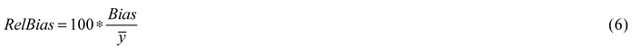 denotes the observed variable. The RMSE and bias calculations were performed for the forest variables basal area weighted mean tree height (BWH), basal area weighted mean tree diameter (BWD), mean stem volume per hectare (MSV), basal area (BA) and stand mean age (MA). Next, the RelRMSE and RelBias were calculated (Eq. 5 and 6):