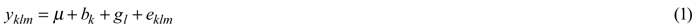 where yklm is the dependent variable (individual tree height or survival), μ is the site mean, bk is the fixed effect of block, gl is the fixed effect of genetic entry, pkl is the random effect of plot for multiple-tree plots, eklm is the residual deviation, k is the number of blocks, l is the number of genetic entries, m is the number of individual trees and