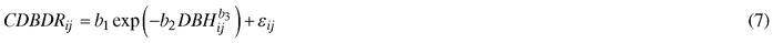 The scattered graph shows a strong relationship between CDBDR and DBH (Fig. 2). Considering this figure (i.e. exponential decrease of CDBDR with increasing DBH), we fitted an exponential decay function, hereafter termed as a base model. Among the various formulations evaluated, the following (Eq. 7) provided the smallest sum of squared errors.