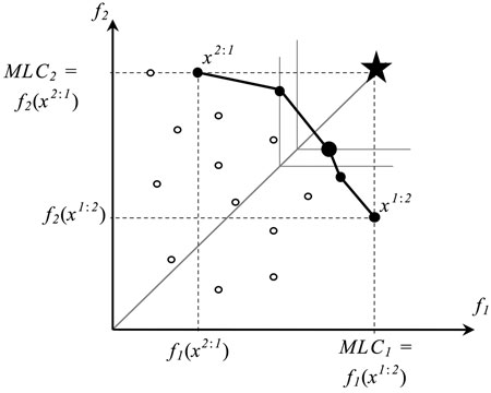 Observe that x1:2 is one of the two extreme solutions introduced in Fig. 1: its outcome (f1(x1:2), f2(x1:2)) represents the Pareto optimal solution with the highest possible value of f1 and the smallest value of f2 (among Pareto optimal solutions). The other extreme solution x2:1 is obtained in an analogous way.