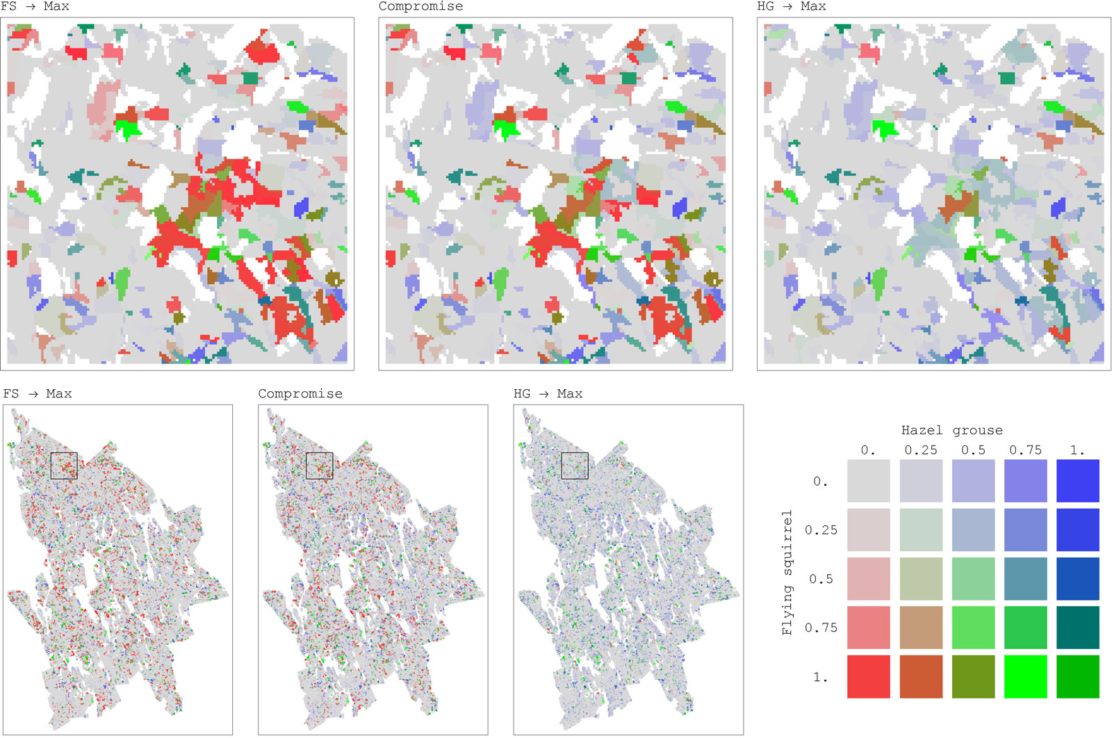 Fig. 5. Maps of distribution of habitat availability values for a pair of conflicting species, flying squirrel (FS) and hazel grouse (HG), in the study area for each forest stand (25 m × 25 m resolution) (maps on top present magnification of regions, outlined in the map at the bottom left with black square borders). Habitat Availability combinations for the two species shown in each of the three maps represent outcomes of the corresponding management plans: maximizing landscape capacity for one species only (FS → Max, HG → Max) and the compromise management plans addressing landscape capacity for both the species. The color palette is defined by the ratio between habitat availability values of the two species. The intensity of the color corresponds to the absolute values of habitat availability. Color legend: red when habitat availability of FS is positive while habitat availability of HG is zero. Blue when habitat availability of HG is positive while habitat availability of FS is zero. Green when both species’ habitat availabilities are positive and “fairly” shared between them. The “fair” share is defined as the ratio between the average values of maximum (across management regimes) habitat availability achieved for each species at each stand, where only positive habitat availability values are considered, for FS and HG these averages are 0.42 and 0.32, respectively. View larger in new window/tab