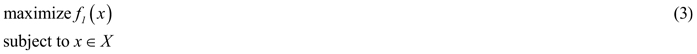 where X is the set of all possible management plans called feasible solutions; k is the number of biodiversity objectives; f1, f2,…,fk are real-valued objective functions, where fk(x) evaluates the management plan x in terms of the k-th objective. The vector (f1(x), f2(x), …, fk(x)) is called the outcome of plan x.