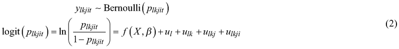 where y is the number of competing birches on the 20-m2 sample plot, the conditional distribution of y, given the expected value π, is the Poisson distribution; ln(π) is a log-link function; f(·) is a linear function with fixed predictor X and fixed parameter β; subscripts i, j, k and l refer to sample plot, uprooted site, municipality and geographical region, respectively; and u’s are random, normally distributed effects with a mean of 0and constant variances. Random effects were assumed to be uncorrelated across levels.
