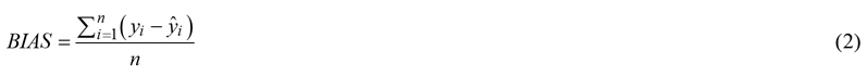 The accuracy between predicted and observed values was tested using root-mean-square error (RMSE, Eq. 1), relative RMSE (%RMSE), BIAS (Eq. 2) and relative BIAS (%BIAS). Both %RMSE and %BIAS were calculated by dividing RMSE and BIAS by the average of observed values and multiplying the result by 100.