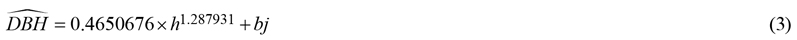 where DBH = diameter at breast height (cm), b1 and b2 = estimated fixed parameters, h = field-measured tree height (m), bj = estimated random parameters.