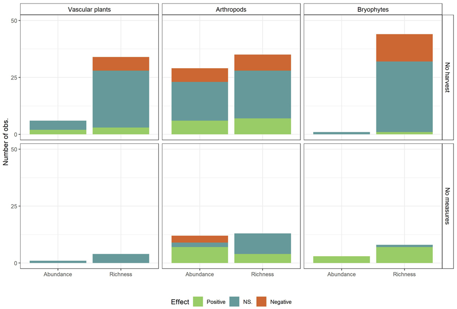 Fig. 3. Observed effects (Positive, NS. (Not significant), Negative) on biodiversity measures (Species richness and abundance) summed of all conservation measures by control (No harvest; No measures (Harvest with no measures)).