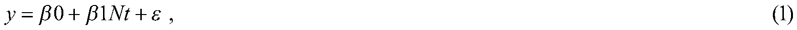 where y is the arcsine-square-root transformed ground vegetation cover change component, Nt is the funnel-trap-observed amount fertilizer amount in the study plot (kg N ha–1), β0 is an intercept and β1 is a slope describing the ground vegetation cover change per amount of funnel-trap-observed N. We used the significance of the β1 term as a measure of the fertilizer impact.
