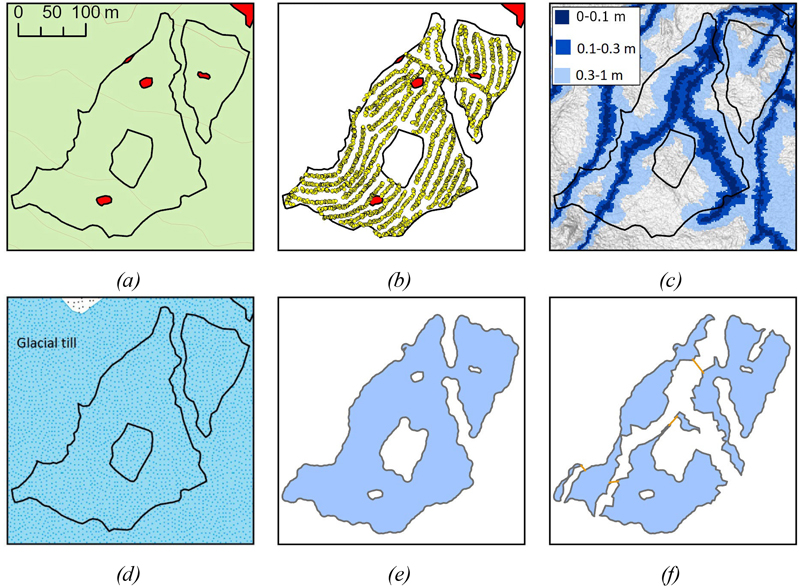 The parts of the PlantP-module relevant for defining the net area for regeneration are described in Fig. 3a–f. The staging position when felling a tree from the hpr files is used to decide the net area for regeneration, including a buffer of 6 m on the outer side of each harvester staging area and 12 m on the inner side (Fig. 3b). A DTW map with a threshold of 0.30 m is used to exclude areas where the modelled groundwater is too close to the surface, preventing the vehicle from becoming immobilized by entering too wet terrain (Fig. 3c). Parent material maps displayed in Fig. 3d from the Geological Survey of Sweden (2021) are used to exclude peat soils. The no-go areas used by Holmen Skog to plan the regeneration area are also excluded (Fig. 3e). Since the machine operator did not exclude areas predicted to be too wet by the DTW model, though such exclusion should be considered, two versions of each site were analyzed: one with the wet areas kept (Fig. 3e) and one with wet areas removed (Fig. 3f). To traverse the wet sections in Fig. 3f, manually placed water crossings marked with yellow lines were used.