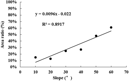 Fig. 7. Relationship between slope and area ratio of gaps induced by flood to total gaps, x: the upper limit of the slope classes, y: the area ratio of new gaps to total gaps.