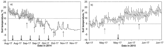 Fig. 1. Soil temperature measured at the depth of 12 cm (the bottom of a peat plug in a seedling planted to the depth of 6 cm) in a mound in a forest site a) just after planting in 2014, and b) in spring 2015. The thick arrows indicate the planting dates, thin arrows the dates when root growth three weeks after planting was assessed, and arrows with broken lines the dates when the initiation of root growth was measured in spring 2015. Broken horizontal lines are for +10 °C in a) and for +5 °C in b).