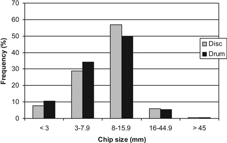 Both chipper types have been in use for many years and much anecdotal evidence is available about their relative merits. Operators state that disc chippers produce more uniform chips than drum chippers, especially if fed with good quality raw material. In contrast, flexible small branches may pass through the disc slots uncomminuted, resulting in low chip quality. For this reason, operators believe that drum chippers are the best when dealing with small-size feedstock, such as tops and branches (Spinelli and Hartsough 2001). Few scientific comparisons of the two chipper types have been made, rarely with comparable settings for the machines (cf. Young and Hatton 1976; Heikka and Piirainen 1981; Liss 1984; Liss 1987).