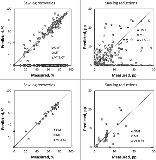 Fig. 3. Saw log recoveries (left) and saw log reductions (right) based on the measured vs. predicted stem quality in Scots pine plots (upper sub-graphs) and stands (lower sub-graphs) by site fertility types. Saw log recoveries are presented as percentages of the total timber volume (%) and saw log reductions are presented as percentage points from the defect free recovery of saw logs (pp).